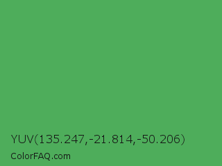 YUV 135.247,-21.814,-50.206 Color is a normal green color and the nearest color is Chateau Green #40a860. Hex code #4ead5b and RGB value is rgb(78,173,91). In RGB color space, this color is composed of 31% red, 68% green, 36% blue, In CMYK color space, this color is composed of 55% cyan, 0% magenta, 47% yellow , 32% black , In HSL color space, this color has a hue angle of 128° , 38% saturation and 49% lightness.