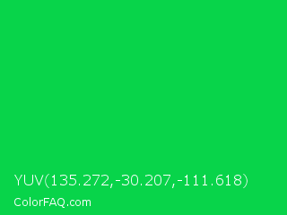 YUV 135.272,-30.207,-111.618 Color is a normal green color and the nearest color is Malachite #0bda51. Hex code #08d44a and RGB value is rgb(8,212,74). In RGB color space, this color is composed of 3% red, 83% green, 29% blue, In CMYK color space, this color is composed of 96% cyan, 0% magenta, 65% yellow , 17% black , In HSL color space, this color has a hue angle of 139° , 93% saturation and 43% lightness.
