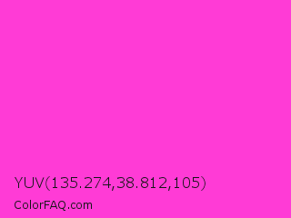 YUV 135.274,38.812,105 Color is a light magenta color and the nearest color is Razzle Dazzle Rose #ff33cc. Hex code #ff3bd6 and RGB value is rgb(255,59,214). In RGB color space, this color is composed of 100% red, 23% green, 84% blue, In CMYK color space, this color is composed of 0% cyan, 77% magenta, 16% yellow , 0% black , In HSL color space, this color has a hue angle of 313° , 100% saturation and 62% lightness.
