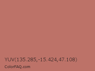 YUV 135.285,-15.424,47.108 Color is a normal red color and the nearest color is Contessa #c6726b. Hex code #bd7268 and RGB value is rgb(189,114,104). In RGB color space, this color is composed of 74% red, 45% green, 41% blue, In CMYK color space, this color is composed of 0% cyan, 40% magenta, 45% yellow , 26% black , In HSL color space, this color has a hue angle of 7° , 39% saturation and 57% lightness.