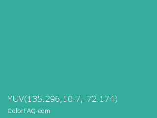 YUV 135.296,10.7,-72.174 Color is a normal cyan color and the nearest color is Keppel #3ab09e. Hex code #35ad9d and RGB value is rgb(53,173,157). In RGB color space, this color is composed of 21% red, 68% green, 62% blue, In CMYK color space, this color is composed of 69% cyan, 0% magenta, 9% yellow , 32% black , In HSL color space, this color has a hue angle of 172° , 53% saturation and 44% lightness.