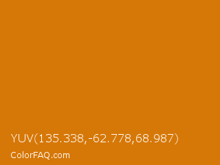 YUV 135.338,-62.778,68.987 Color is a normal orange color and the nearest color is Meteor #d07d12. Hex code #d67808 and RGB value is rgb(214,120,8). In RGB color space, this color is composed of 84% red, 47% green, 3% blue, In CMYK color space, this color is composed of 0% cyan, 44% magenta, 96% yellow , 16% black , In HSL color space, this color has a hue angle of 33° , 93% saturation and 44% lightness.