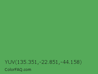 YUV 135.351,-22.851,-44.158 Color is a normal green color and the nearest color is Fruit Salad #4f9d5d. Hex code #55aa59 and RGB value is rgb(85,170,89). In RGB color space, this color is composed of 33% red, 67% green, 35% blue, In CMYK color space, this color is composed of 50% cyan, 0% magenta, 48% yellow , 33% black , In HSL color space, this color has a hue angle of 123° , 33% saturation and 50% lightness.
