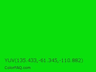 YUV 135.433,-61.345,-110.882 Color is a normal green color and the nearest color is Green #00ff00. Hex code #09e00b and RGB value is rgb(9,224,11). In RGB color space, this color is composed of 4% red, 88% green, 4% blue, In CMYK color space, this color is composed of 96% cyan, 0% magenta, 95% yellow , 12% black , In HSL color space, this color has a hue angle of 121° , 92% saturation and 46% lightness.