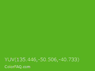YUV 135.446,-50.506,-40.733 Color is a normal green color and the nearest color is Kelly Green #4cbb17. Hex code #59b321 and RGB value is rgb(89,179,33). In RGB color space, this color is composed of 35% red, 70% green, 13% blue, In CMYK color space, this color is composed of 50% cyan, 0% magenta, 82% yellow , 30% black , In HSL color space, this color has a hue angle of 97° , 69% saturation and 42% lightness.