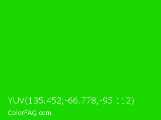YUV 135.452,-66.778,-95.112 Color is a normal green color and the nearest color is Green #00ff00. Hex code #1bd900 and RGB value is rgb(27,217,-0). In RGB color space, this color is composed of 11% red, 85% green, 0% blue, In CMYK color space, this color is composed of 88% cyan, 0% magenta, 100% yellow , 15% black , In HSL color space, this color has a hue angle of 113° , 100% saturation and 43% lightness.