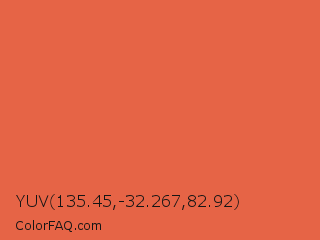 YUV 135.45,-32.267,82.92 Color is a normal red color and the nearest color is Red Damask #da6a41. Hex code #e66446 and RGB value is rgb(230,100,70). In RGB color space, this color is composed of 90% red, 39% green, 27% blue, In CMYK color space, this color is composed of 0% cyan, 57% magenta, 70% yellow , 10% black , In HSL color space, this color has a hue angle of 11° , 76% saturation and 59% lightness.