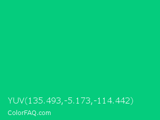 YUV 135.493,-5.173,-114.442 Color is a normal green color and the nearest color is Caribbean Green #00cc99. Hex code #05cc7d and RGB value is rgb(5,204,125). In RGB color space, this color is composed of 2% red, 80% green, 49% blue, In CMYK color space, this color is composed of 98% cyan, 0% magenta, 39% yellow , 20% black , In HSL color space, this color has a hue angle of 156° , 95% saturation and 41% lightness.