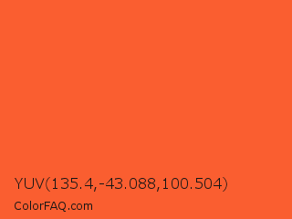 YUV 135.4,-43.088,100.504 Color is a normal red color and the nearest color is Portland Orange #ff5a36. Hex code #fa5e30 and RGB value is rgb(250,94,48). In RGB color space, this color is composed of 98% red, 37% green, 19% blue, In CMYK color space, this color is composed of 0% cyan, 62% magenta, 81% yellow , 2% black , In HSL color space, this color has a hue angle of 14° , 95% saturation and 58% lightness.