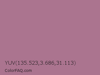 YUV 135.523,3.686,31.113 Color is a normal rose color and the nearest color is Turkish Rose #b57281. Hex code #ab748f and RGB value is rgb(171,116,143). In RGB color space, this color is composed of 67% red, 45% green, 56% blue, In CMYK color space, this color is composed of 0% cyan, 32% magenta, 16% yellow , 33% black , In HSL color space, this color has a hue angle of 331° , 25% saturation and 56% lightness.