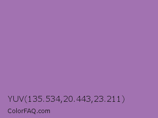 YUV 135.534,20.443,23.211 Color is a normal purple color and the nearest color is Wisteria #9771b5. Hex code #a272b1 and RGB value is rgb(162,114,177). In RGB color space, this color is composed of 64% red, 45% green, 69% blue, In CMYK color space, this color is composed of 8% cyan, 36% magenta, 0% yellow , 31% black , In HSL color space, this color has a hue angle of 286° , 29% saturation and 57% lightness.