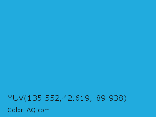 YUV 135.552,42.619,-89.938 Color is a normal blue color and the nearest color is Battery Charged Blue #1dacd6. Hex code #21abde and RGB value is rgb(33,171,222). In RGB color space, this color is composed of 13% red, 67% green, 87% blue, In CMYK color space, this color is composed of 85% cyan, 23% magenta, 0% yellow , 13% black , In HSL color space, this color has a hue angle of 196° , 74% saturation and 50% lightness.