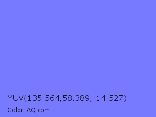 YUV 135.564,58.389,-14.527 Color is a light blue color and the nearest color is Medium Slate Blue #7b68ee. Hex code #7779fe and RGB value is rgb(119,121,254). In RGB color space, this color is composed of 47% red, 47% green, 100% blue, In CMYK color space, this color is composed of 53% cyan, 52% magenta, 0% yellow , 0% black , In HSL color space, this color has a hue angle of 239° , 99% saturation and 73% lightness.
