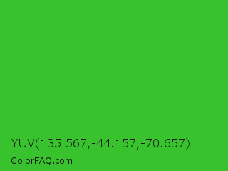 YUV 135.567,-44.157,-70.657 Color is a normal green color and the nearest color is Lime Green #32cd32. Hex code #37c22e and RGB value is rgb(55,194,46). In RGB color space, this color is composed of 22% red, 76% green, 18% blue, In CMYK color space, this color is composed of 72% cyan, 0% magenta, 76% yellow , 24% black , In HSL color space, this color has a hue angle of 116° , 62% saturation and 47% lightness.