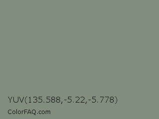 YUV 135.588,-5.22,-5.778 Color is a normal green color and the nearest color is Dolphin Gray #828e84. Hex code #818d7d and RGB value is rgb(129,141,125). In RGB color space, this color is composed of 51% red, 55% green, 49% blue, In CMYK color space, this color is composed of 9% cyan, 0% magenta, 11% yellow , 45% black , In HSL color space, this color has a hue angle of 105° , 7% saturation and 52% lightness.