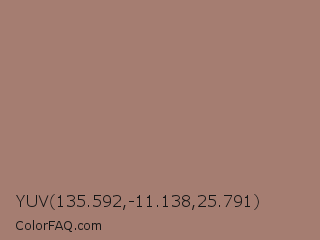 YUV 135.592,-11.138,25.791 Color is a normal red color and the nearest color is Burnished Brown #a17a74. Hex code #a57d71 and RGB value is rgb(165,125,113). In RGB color space, this color is composed of 65% red, 49% green, 44% blue, In CMYK color space, this color is composed of 0% cyan, 24% magenta, 32% yellow , 35% black , In HSL color space, this color has a hue angle of 14° , 22% saturation and 55% lightness.