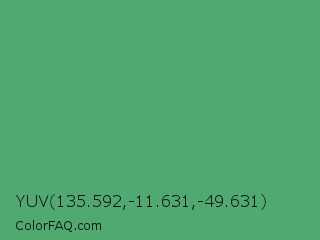 YUV 135.592,-11.631,-49.631 Color is a normal green color and the nearest color is Ocean Green #41aa78. Hex code #4fa970 and RGB value is rgb(79,169,112). In RGB color space, this color is composed of 31% red, 66% green, 44% blue, In CMYK color space, this color is composed of 53% cyan, 0% magenta, 34% yellow , 34% black , In HSL color space, this color has a hue angle of 142° , 36% saturation and 49% lightness.