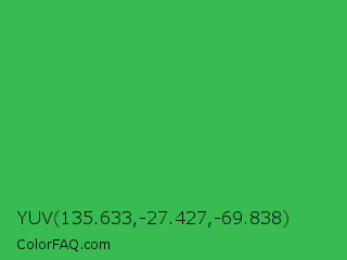 YUV 135.633,-27.427,-69.838 Color is a normal green color and the nearest color is Chateau Green #40a860. Hex code #38bb50 and RGB value is rgb(56,187,80). In RGB color space, this color is composed of 22% red, 73% green, 31% blue, In CMYK color space, this color is composed of 70% cyan, 0% magenta, 57% yellow , 27% black , In HSL color space, this color has a hue angle of 131° , 54% saturation and 48% lightness.
