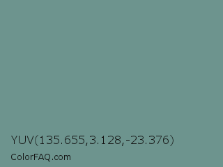 YUV 135.655,3.128,-23.376 Color is a normal cyan color and the nearest color is Juniper #6d9292. Hex code #6d948e and RGB value is rgb(109,148,142). In RGB color space, this color is composed of 43% red, 58% green, 56% blue, In CMYK color space, this color is composed of 26% cyan, 0% magenta, 4% yellow , 42% black , In HSL color space, this color has a hue angle of 171° , 15% saturation and 50% lightness.