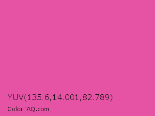 YUV 135.6,14.001,82.789 Color is a light magenta color and the nearest color is Raspberry Pink #e25098. Hex code #e652a4 and RGB value is rgb(230,82,164). In RGB color space, this color is composed of 90% red, 32% green, 64% blue, In CMYK color space, this color is composed of 0% cyan, 64% magenta, 29% yellow , 10% black , In HSL color space, this color has a hue angle of 327° , 75% saturation and 61% lightness.