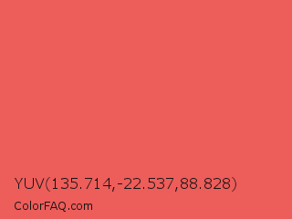 YUV 135.714,-22.537,88.828 Color is a light red color and the nearest color is Carnation #f95a61. Hex code #ed5d5a and RGB value is rgb(237,93,90). In RGB color space, this color is composed of 93% red, 36% green, 35% blue, In CMYK color space, this color is composed of 0% cyan, 61% magenta, 62% yellow , 7% black , In HSL color space, this color has a hue angle of 1° , 80% saturation and 64% lightness.