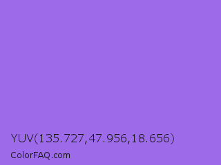 YUV 135.727,47.956,18.656 Color is a light violet color and the nearest color is Medium Purple #9370db. Hex code #9d6ae9 and RGB value is rgb(157,106,233). In RGB color space, this color is composed of 62% red, 42% green, 91% blue, In CMYK color space, this color is composed of 33% cyan, 55% magenta, 0% yellow , 9% black , In HSL color space, this color has a hue angle of 264° , 74% saturation and 66% lightness.