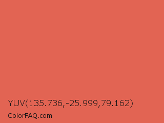 YUV 135.736,-25.999,79.162 Color is a light red color and the nearest color is Jelly Bean #da614e. Hex code #e26453 and RGB value is rgb(226,100,83). In RGB color space, this color is composed of 89% red, 39% green, 33% blue, In CMYK color space, this color is composed of 0% cyan, 56% magenta, 63% yellow , 11% black , In HSL color space, this color has a hue angle of 7° , 71% saturation and 61% lightness.