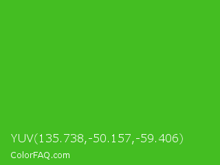 YUV 135.738,-50.157,-59.406 Color is a normal green color and the nearest color is Kelly Green #4cbb17. Hex code #44be22 and RGB value is rgb(68,190,34). In RGB color space, this color is composed of 27% red, 75% green, 13% blue, In CMYK color space, this color is composed of 64% cyan, 0% magenta, 82% yellow , 25% black , In HSL color space, this color has a hue angle of 107° , 70% saturation and 44% lightness.
