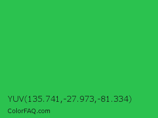 YUV 135.741,-27.973,-81.334 Color is a normal green color and the nearest color is Lime Green #32cd32. Hex code #2bc24f and RGB value is rgb(43,194,79). In RGB color space, this color is composed of 17% red, 76% green, 31% blue, In CMYK color space, this color is composed of 78% cyan, 0% magenta, 59% yellow , 24% black , In HSL color space, this color has a hue angle of 134° , 64% saturation and 46% lightness.