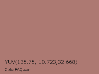 YUV 135.75,-10.723,32.668 Color is a normal red color and the nearest color is Burnished Brown #a17a74. Hex code #ad7972 and RGB value is rgb(173,121,114). In RGB color space, this color is composed of 68% red, 47% green, 45% blue, In CMYK color space, this color is composed of 0% cyan, 30% magenta, 34% yellow , 32% black , In HSL color space, this color has a hue angle of 7° , 26% saturation and 56% lightness.