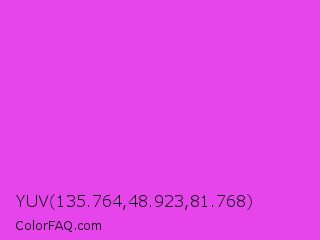 YUV 135.764,48.923,81.768 Color is a normal magenta color and the nearest color is Purple Pizzazz #fe4eda. Hex code #e545eb and RGB value is rgb(229,69,235). In RGB color space, this color is composed of 90% red, 27% green, 92% blue, In CMYK color space, this color is composed of 3% cyan, 71% magenta, 0% yellow , 8% black , In HSL color space, this color has a hue angle of 298° , 81% saturation and 60% lightness.
