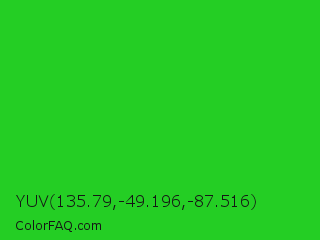 YUV 135.79,-49.196,-87.516 Color is a normal green color and the nearest color is Lime Green #32cd32. Hex code #24ce24 and RGB value is rgb(36,206,36). In RGB color space, this color is composed of 14% red, 81% green, 14% blue, In CMYK color space, this color is composed of 83% cyan, 0% magenta, 83% yellow , 19% black , In HSL color space, this color has a hue angle of 120° , 70% saturation and 47% lightness.