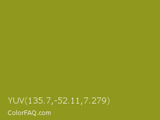 YUV 135.7,-52.11,7.279 Color is a normal yellow color and the nearest color is Citron #9fa91f. Hex code #90981e and RGB value is rgb(144,152,30). In RGB color space, this color is composed of 56% red, 60% green, 12% blue, In CMYK color space, this color is composed of 5% cyan, 0% magenta, 80% yellow , 40% black , In HSL color space, this color has a hue angle of 64° , 67% saturation and 36% lightness.