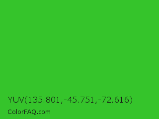 YUV 135.801,-45.751,-72.616 Color is a normal green color and the nearest color is Lime Green #32cd32. Hex code #35c42b and RGB value is rgb(53,196,43). In RGB color space, this color is composed of 21% red, 77% green, 17% blue, In CMYK color space, this color is composed of 73% cyan, 0% magenta, 78% yellow , 23% black , In HSL color space, this color has a hue angle of 116° , 64% saturation and 47% lightness.