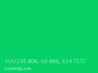 YUV 135.806,-16.666,-114.717 Color is a normal green color and the nearest color is Malachite #0bda51. Hex code #05d166 and RGB value is rgb(5,209,102). In RGB color space, this color is composed of 2% red, 82% green, 40% blue, In CMYK color space, this color is composed of 98% cyan, 0% magenta, 51% yellow , 18% black , In HSL color space, this color has a hue angle of 149° , 95% saturation and 42% lightness.