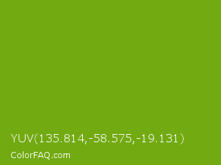 YUV 135.814,-58.575,-19.131 Color is a normal green color and the nearest color is Christi #67a712. Hex code #72aa11 and RGB value is rgb(114,170,17). In RGB color space, this color is composed of 45% red, 67% green, 7% blue, In CMYK color space, this color is composed of 33% cyan, 0% magenta, 90% yellow , 33% black , In HSL color space, this color has a hue angle of 82° , 82% saturation and 37% lightness.