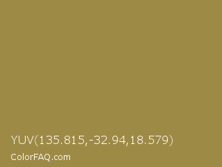 YUV 135.815,-32.94,18.579 Color is a normal yellow color and the nearest color is Sycamore #908d39. Hex code #9d8a45 and RGB value is rgb(157,138,69). In RGB color space, this color is composed of 62% red, 54% green, 27% blue, In CMYK color space, this color is composed of 0% cyan, 12% magenta, 56% yellow , 38% black , In HSL color space, this color has a hue angle of 47° , 39% saturation and 44% lightness.