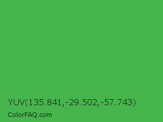 YUV 135.841,-29.502,-57.743 Color is a normal green color and the nearest color is Apple #4fa83d. Hex code #46b54c and RGB value is rgb(70,181,76). In RGB color space, this color is composed of 27% red, 71% green, 30% blue, In CMYK color space, this color is composed of 61% cyan, 0% magenta, 58% yellow , 29% black , In HSL color space, this color has a hue angle of 123° , 44% saturation and 49% lightness.