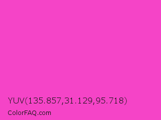 YUV 135.857,31.129,95.718 Color is a light magenta color and the nearest color is Razzle Dazzle Rose #ff33cc. Hex code #f544c7 and RGB value is rgb(245,68,199). In RGB color space, this color is composed of 96% red, 27% green, 78% blue, In CMYK color space, this color is composed of 0% cyan, 72% magenta, 19% yellow , 4% black , In HSL color space, this color has a hue angle of 316° , 90% saturation and 61% lightness.