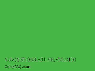 YUV 135.869,-31.98,-56.013 Color is a normal green color and the nearest color is Apple #4fa83d. Hex code #48b547 and RGB value is rgb(72,181,71). In RGB color space, this color is composed of 28% red, 71% green, 28% blue, In CMYK color space, this color is composed of 60% cyan, 0% magenta, 61% yellow , 29% black , In HSL color space, this color has a hue angle of 119° , 44% saturation and 49% lightness.