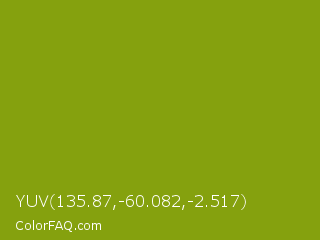 YUV 135.87,-60.082,-2.517 Color is a normal lime color and the nearest color is Limeade #6f9d02. Hex code #85a10e and RGB value is rgb(133,161,14). In RGB color space, this color is composed of 52% red, 63% green, 5% blue, In CMYK color space, this color is composed of 17% cyan, 0% magenta, 91% yellow , 37% black , In HSL color space, this color has a hue angle of 71° , 84% saturation and 34% lightness.