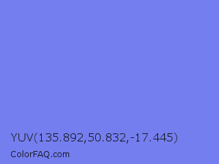 YUV 135.892,50.832,-17.445 Color is a light blue color and the nearest color is Medium Slate Blue #7b68ee. Hex code #747eef and RGB value is rgb(116,126,239). In RGB color space, this color is composed of 45% red, 49% green, 94% blue, In CMYK color space, this color is composed of 51% cyan, 47% magenta, 0% yellow , 6% black , In HSL color space, this color has a hue angle of 235° , 79% saturation and 70% lightness.