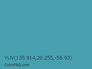 YUV 135.914,20.255,-56.93 Color is a normal cyan color and the nearest color is Hippie Blue #589aaf. Hex code #47a1b1 and RGB value is rgb(71,161,177). In RGB color space, this color is composed of 28% red, 63% green, 69% blue, In CMYK color space, this color is composed of 60% cyan, 9% magenta, 0% yellow , 31% black , In HSL color space, this color has a hue angle of 189° , 43% saturation and 49% lightness.
