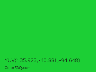 YUV 135.923,-40.881,-94.648 Color is a normal green color and the nearest color is Lime Green #32cd32. Hex code #1ccf35 and RGB value is rgb(28,207,53). In RGB color space, this color is composed of 11% red, 81% green, 21% blue, In CMYK color space, this color is composed of 86% cyan, 0% magenta, 74% yellow , 19% black , In HSL color space, this color has a hue angle of 128° , 76% saturation and 46% lightness.