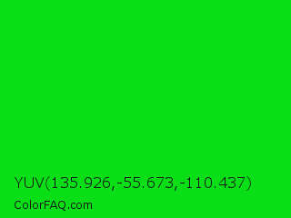 YUV 135.926,-55.673,-110.437 Color is a normal green color and the nearest color is Vivid Malachite #00cc33. Hex code #0ade17 and RGB value is rgb(10,222,23). In RGB color space, this color is composed of 4% red, 87% green, 9% blue, In CMYK color space, this color is composed of 95% cyan, 0% magenta, 90% yellow , 13% black , In HSL color space, this color has a hue angle of 124° , 91% saturation and 45% lightness.