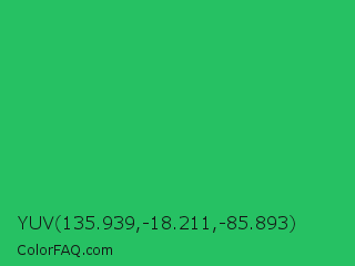 YUV 135.939,-18.211,-85.893 Color is a normal green color and the nearest color is Medium Sea Green #3cb371. Hex code #26c163 and RGB value is rgb(38,193,99). In RGB color space, this color is composed of 15% red, 76% green, 39% blue, In CMYK color space, this color is composed of 80% cyan, 0% magenta, 49% yellow , 24% black , In HSL color space, this color has a hue angle of 144° , 67% saturation and 45% lightness.