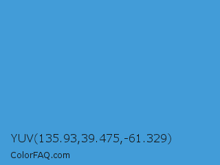 YUV 135.93,39.475,-61.329 Color is a normal blue color and the nearest color is Celestial Blue #4997d0. Hex code #429cd8 and RGB value is rgb(66,156,216). In RGB color space, this color is composed of 26% red, 61% green, 85% blue, In CMYK color space, this color is composed of 69% cyan, 28% magenta, 0% yellow , 15% black , In HSL color space, this color has a hue angle of 204° , 66% saturation and 55% lightness.