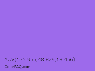 YUV 135.955,48.829,18.456 Color is a light violet color and the nearest color is Medium Purple #9370db. Hex code #9d6aeb and RGB value is rgb(157,106,235). In RGB color space, this color is composed of 62% red, 42% green, 92% blue, In CMYK color space, this color is composed of 33% cyan, 55% magenta, 0% yellow , 8% black , In HSL color space, this color has a hue angle of 264° , 76% saturation and 67% lightness.