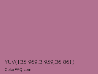 YUV 135.969,3.959,36.861 Color is a normal rose color and the nearest color is Turkish Rose #b57281. Hex code #b27190 and RGB value is rgb(178,113,144). In RGB color space, this color is composed of 70% red, 44% green, 56% blue, In CMYK color space, this color is composed of 0% cyan, 37% magenta, 19% yellow , 30% black , In HSL color space, this color has a hue angle of 331° , 30% saturation and 57% lightness.