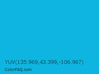 YUV 135.969,43.399,-106.967 Color is a normal cyan color and the nearest color is Cyan Process #00b7eb. Hex code #0eb5e0 and RGB value is rgb(14,181,224). In RGB color space, this color is composed of 5% red, 71% green, 88% blue, In CMYK color space, this color is composed of 94% cyan, 19% magenta, 0% yellow , 12% black , In HSL color space, this color has a hue angle of 192° , 88% saturation and 47% lightness.